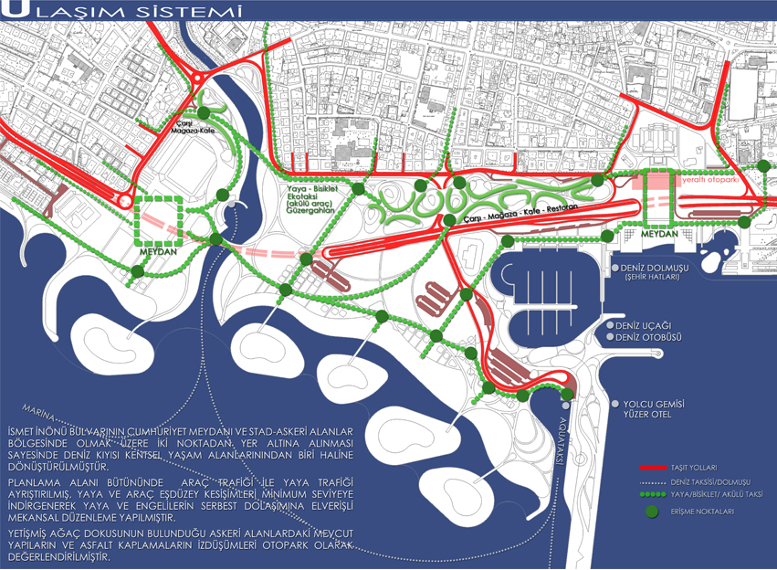87250 RUMUZLU PROJE (1.ELEME) Akdeniz’in incisi olarak anılan Mersin, 1950’li yıllarda limanın faaliyete geçmesi ile ekonomik canlılığa kavuşmuş ve orta büyüklükteki sahil kasabasından ülkenin en önemli liman kenti konumuna erişmiştir. Kentin gelişmeye başlamasıyla ihtiyaç duyulan alansal gereksinimler, yapılaşmış kentsel alana müdahaleden ziyade genellikle denizin doldurulması sayesinde kazanılan alanlardan karşılanmıştır. Bu yöndeki kolaycı uygulamalar, zamanla ve fark edilmeksizin kentin sosyal yaşantısını da “deniz yaşantısından” uzaklaştırmış ve Mersini ticari anlamda “denizcilik yaşantısı”nın hakim olduğu bir kente dönüştürmüştür. Hazırladığımız proje; yüzyılın başlarından itibaren kentin denizle buluştuğu kesiminde yaşanan mekânsal ve sosyal başkalaşım sürecinde kentsel yaşamın dışına savrulan unsurları toparlayarak, Mersin´i sadece deniz ticareti ile ekonomisini ayakta tutan “DENİZCİLİK KENTİ" algısından kurtarıp, sosyal yaşantısına denizi yeniden dâhil etmek suretiyle, sahillerinden denize girilebilen, denizi “Sürdürülebilir Çevre Stratejisi" çerçevesinde koruyan, sınırları aşan deniz kültürünü küresel manada ortak değer olarak gören “DENİZ KENTİ” kimliğine kavuşturmayı hedeflemiştir. Bu bağlamda, çalışma alanını “öncelikli alan” olarak algılayan, işlevsel ilişkileri makro düzeyde analiz eden, kentin farklılaşan bölgeleri ile proje alanı arasındaki bağı ortaya koyarak aralarındaki mekânsal ilişkilerden elde edilen çıkarımları eyleme dönüştüren bir planlama felsefesi benimsenmiştir. Makroform ölçeğinde ele alınan kurgusal bağıntı, alanda var olan sorunlar, olanaklar, fırsatlar ve tehditler temelinde fiziksel mekâna indirgenerek müdahale biçimleri geliştirilmiş ve planlama kararları üretilmiştir. PLAN KURGUSU Ülkenin en önemli tarım havzası olan Çukurova’dan elde edilen ürünlerin dünyaya pazarlanmasının yanı sıra Adana bölgesindeki sanayinin de kullanabileceği şekilde kentin doğusunda konumlanmış olan liman, bu bölgeyi ticaret, sanayi ve lojistik hizmetlerinde uzmanlaşmış iş ve istihdam bölgesi durumuna getirmiştir. Çukurova bölgesindeki dominant üç yerleşiminin (Adana, Mersin, Tarsus) bir birlerine çok yakın konumda yer aldığı 70 km.lik güzergâh, bir anlamda bölgeyi bütünleşik kent pozisyonuna getirmektedir. Bu yerleşimlerin ortak üretim ve istihdam bölgesi niteliğindeki endüstriyel koridorun, yakın zamanda Tarsus-Kazanlı sahilinin turizm merkezi ilan edilmesi ile yaz turizmi açısından da önemli bir çekim merkezi haline geleceği öngörülmüştür. Bölgede var olan endüstriyel odak özelliğine turizm odağı özelliğinin eklenmesi ile daha da artacak olan araç trafiğine alternatif olarak, başlangıç noktası proje alanı olacak şekilde Mersin ile havaalanı arasında turizm merkezi üzerinden bir denizyolu bağlantısı kurgulanmış olup, yoğun kamyon ve tır trafiğine sahip mevcut karayolu üzerinde seyreden endüstriyel ürün taşımacılığından etkilenmeyecek şekilde kent merkezi-havaalanı ulaşım bağlantısı sağlanmıştır. Kentin batı gelişme aksı ise doğu aksından tamamen farklı bir nitelik göstermektedir; Yoğun kentsel alandan çepere doğru Antalya karayolu boyunca uzanan tatil sitelerinin yer aldığı bu bölge; zamanla kentle birleşen yoğun bir yapıya sahip olup kentin varlıklı kesimi açısından gelişme aksı özelliği ile ön plana çıkmaktadır. Bu bölgelerde var olan ve tatil dönemlerinde yoğunlaşan ikincil konut tarzındaki geçici iskan özelliğinin kalıcı iskan bölgelerine dönüşerek kente eklemlenme döngüsünün artarak devam edeceği öngörülmüş, kentsel fonksiyonel ilişkilerin yoğun yaşandığı merkeze yakın kısımlardan çepere doğru seyrekleşen bir deniz ulaşımının kentsel ulaşım sistemine entegre edilmesi ve bu bağlantının kent merkezi ilişkisinin proje alanından sağlanması kurgulanmıştır. PLANLAMA KARARLARI Proje alanı, kentin ulaşım bağlantılarının üst seviyede olduğu bir konumunda yer almasına rağmen, aralarında işlevsel bağ bulunmayan kullanımlardan oluşması nedeniyle erişilebilirlik kriterleri açısından hatalı(!) kullanım kararları nedeniyle kentin ulaşılabilirliği yüksek seviyedeki deniz ile iç içe olan bölgesi erişilemez bir duruma dönüşmüş vaziyettedir. Kaldı ki, işlevsel bağı bulunan kullanımlar arasında da (meydan ile sahil parkı örneğinde olduğu gibi) yoğun araç trafiğine sahip olan Bulvarın “ayraç” özelliğinin olumsuz etkisi görülmektedir. Planlama alanının ortasından doğu batı istikametinde geçen Bulvar, çalışma alanını kuzey güney olmak üzere iki parçaya bölerken, fiziksel eşik niteliğindeki Müftü Deresi de stadyum ve deniz feneri bölgesini, alan bütününden koparmaktadır. Dolayısıyla, planlama alanı eşikler ve ayraçlarla dört parçaya bölünmüş, aralarında işlevsel ve kurgusal bir bağ bulunmayan arazi kullanım kararlarına sahip kent parçası görünümündedir. Bu parçalı yapının ortadan kaldırılarak, ilintisiz kullanımlarının yarattığı sorunları ve olumsuzlukları, olanaklar ve fırsatlar ölçüsünde gideren bir müdahale yöntemi geliştirilmiştir. Bulvarın yanı sıra sahil ile konut bölgeleri arasındaki ilişkiyi kesen askeri tesislerin kaldırılması yönündeki iradenin getirdiği pozitif etki, bu alanların kamusal alanlara dönüştürülmesi yönünde cesur kararlar üretilebilmesine imkan vermiştir. Ulaşım Sistemi ; Bulvar güzergâhının kent ile sahil arasındaki doğrusal ilişkiyi olumsuz etkilediği iki noktaya müdahale edilmesi ve yolun yer altına alınması yönünde plan kararı üretilerek, fiziksel eşiklerin ve yolun ayraç özelliğinin getirdiği olumsuzluklar giderilmiş ve kull