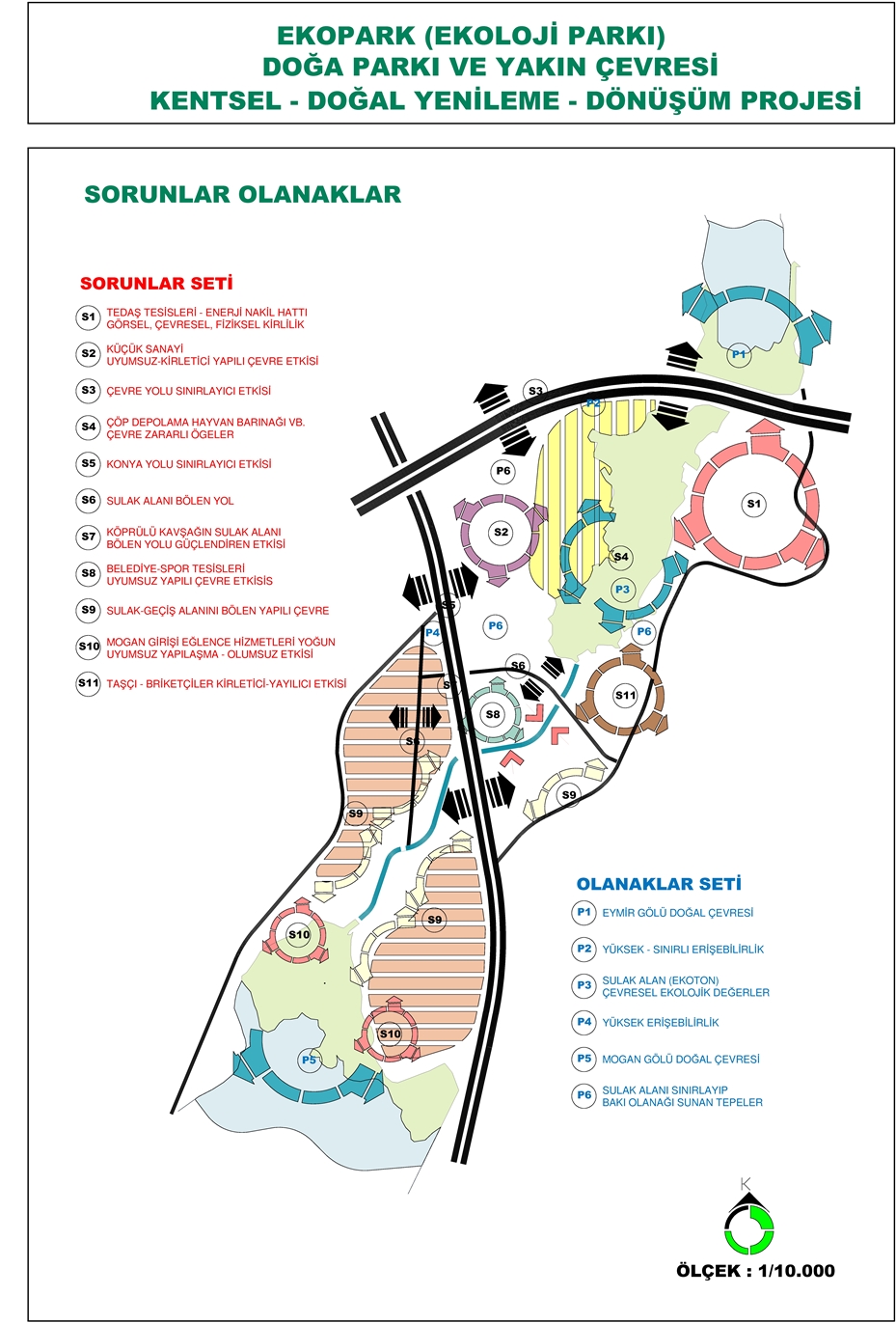 1.MANSİYON KAZANAN 28100 RUMUZLU PROJE Temel Yaklaşım : Mogan, Eymir gölleri ve çevresindeki alan çok sayıda kanatlının barınıp ürediği bir nitelik göstermesi yanısıra, zengin bir floraya da sahip olması açısından ekolojik bir planlama anlayışıyla ele alınması gereken “özel bir çevre” dir. Bu özel çevrede doğayı “sürdürülebilir çevre ” stratejisi içerisinde korumaya olanak sağlayacak ve bölgeyi kent bütünü ölçeğinde “öncelikli alan” olarak algılayacak bir planlama felsefesi tanımlanmalıdır. Bu anlayış; İmrahor Vadisi, Eymir, Mogan üçgeninde Tuz Gölü’ne dek uzanan bir bölge ekosisteminin ortaya konmasıyla başlayacaktır. Mogan ve Eymir göllerini anılan sistemin parçası ve odak noktası olarak görerek bir devamlılık içerisinde ele alan bu yaklaşımda; her iki gölün aktif korunup doğaya kazandırılması yanısıra, göller arasındaki ekolojik birlikteliğin gerçekleştirilip, sürekliliğin sağlanması ve sürdürülebilir çevreler oluşturulabilmesi için çevredeki yapılaşmış alanlarda da yenileme çalışmalarının yapılması hedeflenmektedir. Söz konusu yenileme çalışması, basitçe yeni gelişme alanları ile yapılı çevrenin birbirinden ayrılması biçiminde gerçekleşmemelidir. Eklenen ve değişen gereksinimler fiziksel ve sosyo kültürel aktivitelerin de yenilenmesini gerekli kılmaktadır. Yerleşik alanda kümelenen sorunlar ve göller arası birlikteliğe zarar verecek gelişmeler yaşanırken, yeni gelişme alanlarına düşük bir yoğunluk vererek yeterli koruma sağlanması olanaklı değildir. Mogan ve Eymir göllerini, bağlantılarını ve sistemin sürekliliğini sağlayacak, aksı bir bütün ve öncelikli olarak ele alacak bir yaklaşımla, oluşturulacak olumlu etkinin kent ve bölge bütününe yayılması da sağlanabilecektir (Malbert,1994). Korunması gerekli bir çok doğal güzelliğe ve özgünlüğe sahip Gölbaşı Özel Çevre Koruma Bölgesi’nin odak noktası niteliğindeki iki göl ve bunların sürekliliği- devamlılığını sağlayan sistem, gerek kentsel yaşam ve gerekse doğal çevre açısından sorunların yoğunlaştığı bir “öncelikli alan” olarak göze çarpmaktadır. Böylesi bir alanda sorunların çözümü ve “tahrip” edilmiş bir doğa parçasının yeniden doğaya kazandırılabilmesi amacının klasik bir imar planlama anlayışıyla gerçekleşemeyeceği açıktır. Söz konusu özgün çevreyi ekolojik bir yaklaşımla ele almak ve bunun için alandaki yapılara ve arazi kullanım kararlarına müdahale edebilecek yenilenmelere gereksinim vardır. Bu kapsamda, öncelikle iki gölün birlikteliği sağlanmalı, ardından Eymir- İmrahor aksını vurgulayıp, sistemi bütüncül olarak algılayacak sistematik, ekolojik ve özgün bir planlama dili oluşturulmalıdır. Bu yarışma, sözü edilen planlama felsefesinin ortaya konması açısından çok büyük önem taşımakta olup, tek başına yetersizdir. Yarışma sonucunda bölge odağına ve sistemin bir parçasına ilişkin çözüm önerileri geliştirilmiş olacaktır. Ancak, vadiler sistemi ve ekolojik bütünlüğün çözüme kavuşması, İmrahor-Eymir-Mogan üçgeni ve oradan da Tuz Gölü’ne uzanan alanda (yönetsel, hukuksal, planlama v.b sorunların çözümlenmesi ile birlikte) ekolojik devamlılığın sağlanması ile olanaklı olabilecektir. Stratejiler : Mogan gölünde yoğunlaşan çevre sorunları (ötrofikasyon, kirlenme v.b) ve göl doğal yapısının korunabilmesi yada yeniden doğaya kazandırılabilmesi için, bölgede genel nüfus ve yapı yoğunluğu kontrol altına alınmalı, yapılı çevrenin doğal yaşam ve ekolojik dengeye zarar veren ögeleri arındırılmalıdır. Mogan gölünün gölbaşı yerleşimiyle birleştiği alan ve göller arasında su akımını, sürekliliği sağlayan kanal ve çevresi doğal niteliğine uygun olarak yeniden ele alınmalı, ekolojik birlikteliği sağlayacak biçimde yeniden düzenlenmeli ve bölgenin doğal rekreatif potansiyeli etkin çimde bu aksta değerlendirilmelidir. İki göl arasında, karmaşık sorunlarla yüklü, büyük ölçüde tahrip edilmiş sulak alanın; gerek Eymir gölünün varlığını sürdürebilmesi, gerek Mogan-Eymir-İmrahor üçgeninde ekolojik devamlılığın sağlanması ve gerekse Başkent Ankara’nın girişinde bölge karakteristiğine ve Başkent Kimliğine uygun, özgün bir doğa parçası olarak kente-doğaya kazandırılması sağlanmalıdır. Ankara metropolünün eğlence ve rekreasyon gereksinimleri için büyük bir önem taşıyagelen planlama alanının, Ankara kentinin girişinde kentin algılanıp, kent ve doğa imgesinin vurgulandığı, Başkente özgü Öncü-Örnek rolün ve özgün kimliğin simgelendiği bir merkez olarak ele alınması gerekmektedir. Böylesi bir yaklaşımla oluşturulacak gerçek doğa benzeşimi bir park ve tahrip edilmiş doğayı kendisine kazandıracak kentsel yenileme projesi; Ankara kentinin öncü örnek rolüyle de uyum sağlatıp, kente hizmet etmesi yanında ülkesel planlama ve peyzaj tasarımına da yeni ufuklar açabilecektir. Proje alanındaki mutlak koruma bölgelerine (sazlık, bataklık, sulak alanlar) herhangi bir müdahale yapılmayacak, bu alanlardaki koruma ve iyileştirme çalışmaları dolaylı etkiler göz önüne alınarak uygulanacaktır. Bu bağlamda alanda ayrıntılı bir kullanım-yönetim planı oluşturulmalıdır. Buna bağlı olarak her hangi bir tehlike durumunda uygulanacak işlemler belirlenmelidir. Yine uzun vadedeki bir koruma çalışması için bu hassas ekosistemlerin özellikleri ve önemi konusunda ilgili çevreleri ve kamuoyunu aydınlatacak ve yönlendirecek çalışmalar yapılmalıdır. Bu bölgedeki sulak alanları kirleten her türlü tesisin gerekli arıtma tesisini kurması sağlanmalıdır. Kirletici atık su kaynakları belirlenmeli ve organik kirleticiler ile besin madd
