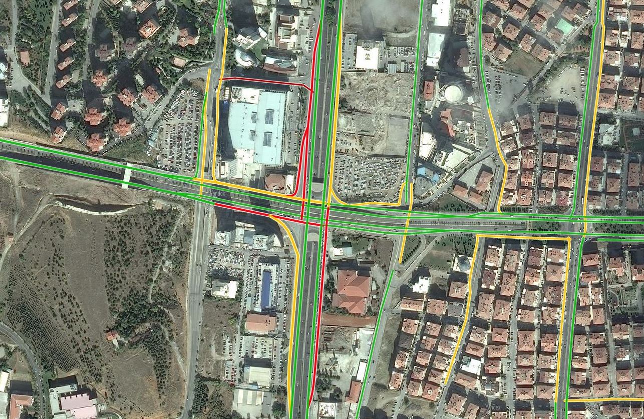 Melikşah Kavşağı (MEVLANA BLV. - MALAZGİRT BLV. KESİŞİMİ) KAVŞAK İYİLEŞTİRMESİ FİKİR PROJESİ Ankara’nın en önemli ulaşım akslarından olan Konya Yolunun (Mevlana Bulvarı) Eskişehir yolu, İstanbul yolu ve Çevre yoluna erişimini sağlayan Malazgirt Bulvarı kesişiminde yer alan kavşağın mevcut tasarımından kaynaklan sıkıntılar yaşanmaktadır. Kavşağın mevcut trafik akış şeması (görüntü: Yandex Trafik 09/02/2017C.tesi10:00) Gerek Mevlana gerekse Malazgirt Bulvarları mevcut trafik yoğunlukları nedeniyle birer iç çevre yolu niteliğindedir. Dolayısıyla her iki bulvarın kesiştiği kavşağın klasik yonca tarzında ve 8 yöne de rahat dönüş sağlaması gerekmektedir. Ancak mevcut kavşak üç katlı olarak yapılmış, her iki bulvarın doğrusal trafik akışı alt ve üst geçitler ile sağlanarak sol ve sağ katılımlar ışıklı kavşak sistemi ile çözülmeye çalışılmıştır. Söz konusu Bulvarlar üzerinde seyreden trafiğin birbirine katılımını sağlayan dönüşlerin ışıklı çözümü, özellikle trafik akışı açısından yoğun olarak kullanılan sola dönüşlerde (kesişme olmasından dolayı) yığılmalara sebep olmakta, bu yığılma tasarım açısından rahat olan sağa dönüşleri de olumsuz etkilemektedir. Mevlana Bulvarı üzerinde merkez istikametinde seyreden araç trafiği ağırlıklı olarak Eskişehir ve İstanbul yollarına erişimi sağlayan sola dönüşü kullanmaktadır. Aynı şekilde merkez istikametinden gelenler de ağırlıklı olarak Dikmen istikametine gitmek için sola dönüş yönünü kullanmaktadır. Benzer şekilde Malazgirt bulvarında; ODTÜ yönünden gelenlerin merkez yöne ve Dikmen tarafından gelenlerin de Gölbaşı istikametine dönüşü ağırlıklı olarak kullandığından sola dönüşlerde ışıklardan kaynaklı yığılmalar meydana gelmektedir. Sağa veya sola dönmek isteyen araçlar dönüş kanalına kadar aynı katılım yolunu kullanmak zorunda olduğundan sola dönüşlerden kaynaklanan tıkanıklık, ışıktan bağımsız çözümlenen sağa dönüşleri de olumsuz etkilemekte ve geriye doğru birikmeler olmaktadır. Ortaya konulan sorunun giderilebilmesi için sola dönüşlerin rahatlatılması ve kesintisiz bir hale getirilmesi gerekmektedir. Kavşağın mevcut 3 katlı yapısı ve çevresinin yapılaşmış olması nedeniyle ilave kavşak kolu veya mevcut kavşak kollarında iyileştirme yapılabilmesi imkan dahilinde değildir. Bu nedenle Malazgirt Bulvarının her iki istikametinden Mevlana Bulvarına olan sola dönüşler Mevlana Bulvarı üzerinde yapılacak iki adet “U” dönüşü sayesinde kesintisiz hale getirilmesi, Konya Yolundan Malazgirt Bulvarına olan sola dönüşlerin ise hemzeminde kesişmesiz çapraz geçişler şeklinde düzenlenmesi önerilmektedir.