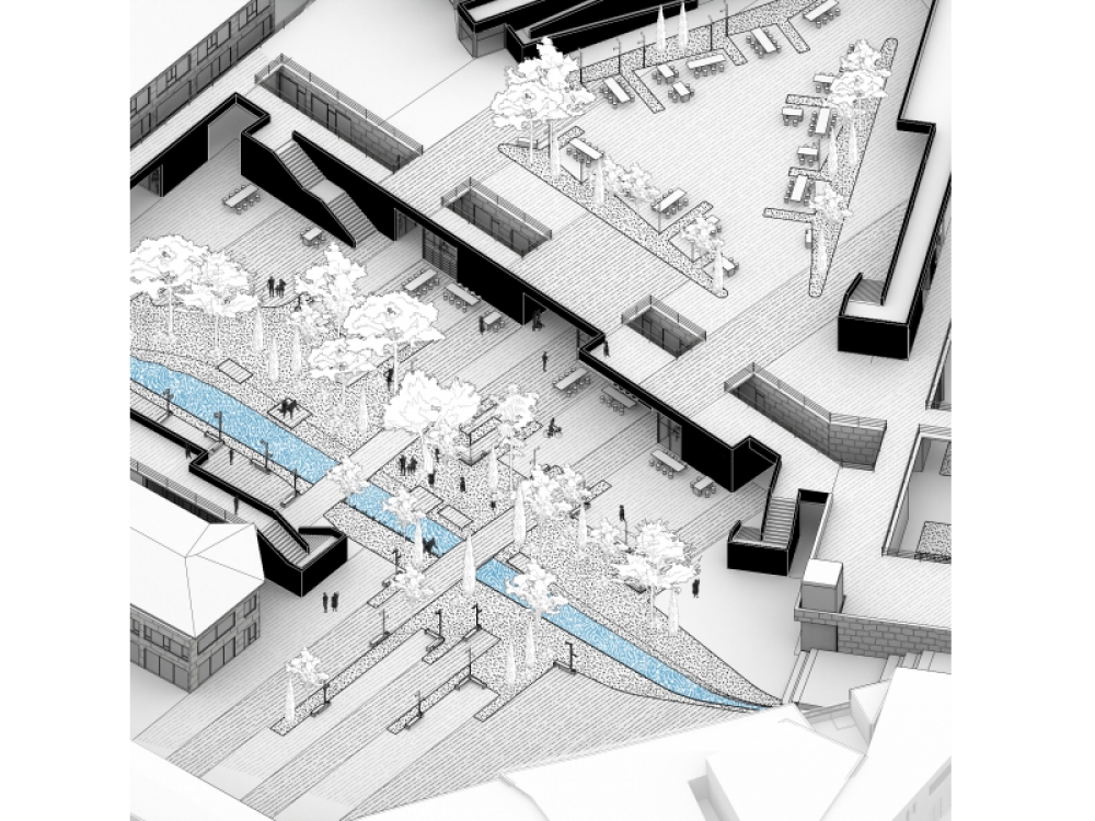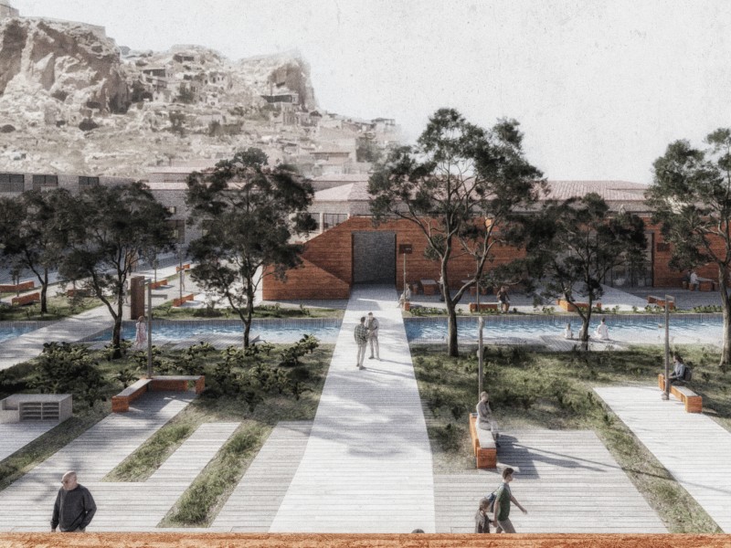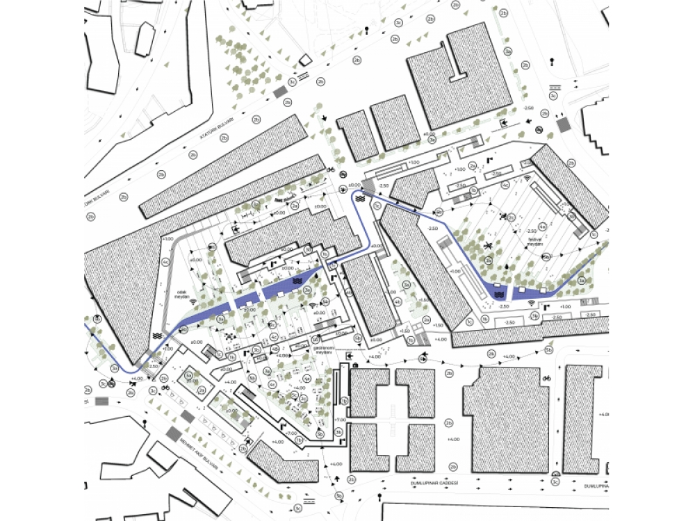 Bu tasarım suyun bağlayıcılığını kullanarak dere üzerinde yer alan Cumhuriyet Meydanı ve yarışma alanı arasında bağlantı kurmayı, mevcut olanı dışlamadan kentsel sürekliliği oluşturmayı ve su/yeşil birlikteliğiyle kamusal alanları organize etmeyi amaçlar. Burada bahsedilen süreklilik Ürgüp’e dair yeni kurguları etrafında toplayan alanları tanımlar; hayata dair ve dahil olan, üreten, paylaşan bir toplumun hikayelerinin anlatıldığı noktalar bütünüdür. |